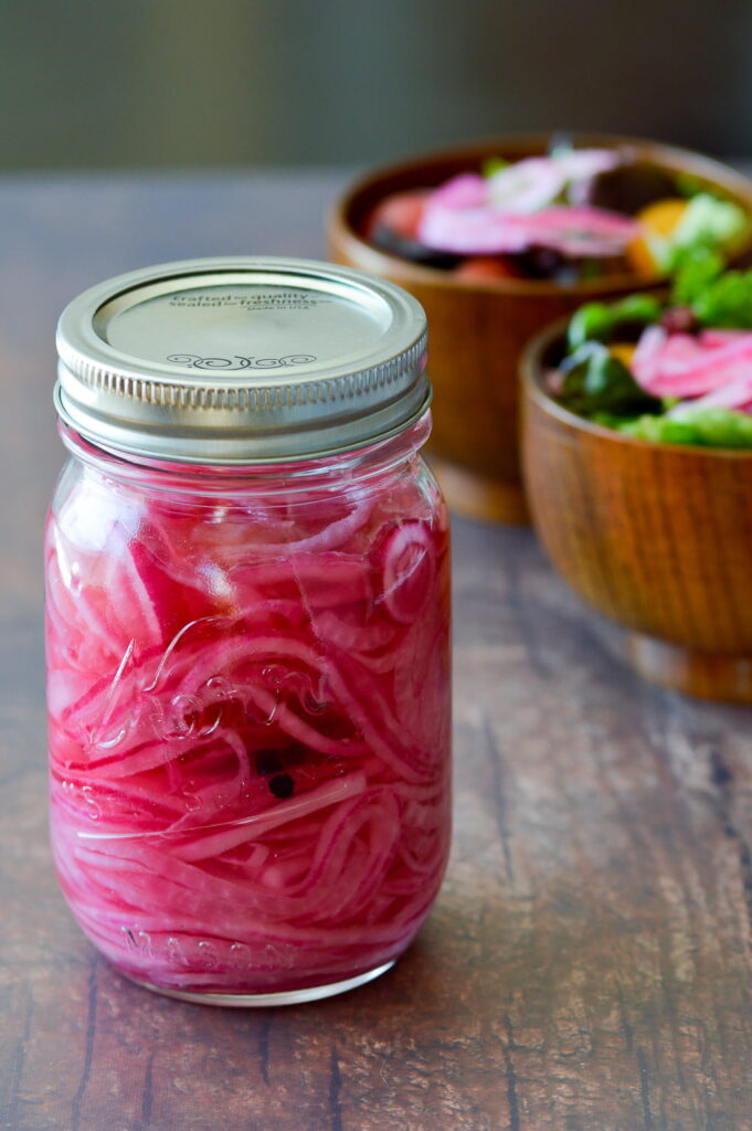 Zwiebeln in feine Ringe schneiden, mit Zucker und Essig einlegen (Pickled Onions).
